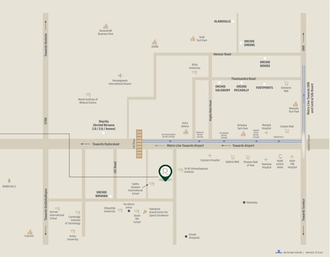 The project is strategically located on MVIT Road, Bettalsoor Cross, with excellent connectivity to Kempegowda International Airport (KIA), Outer Ring Road (ORR), Manyata Tech Park, and Yelahanka.